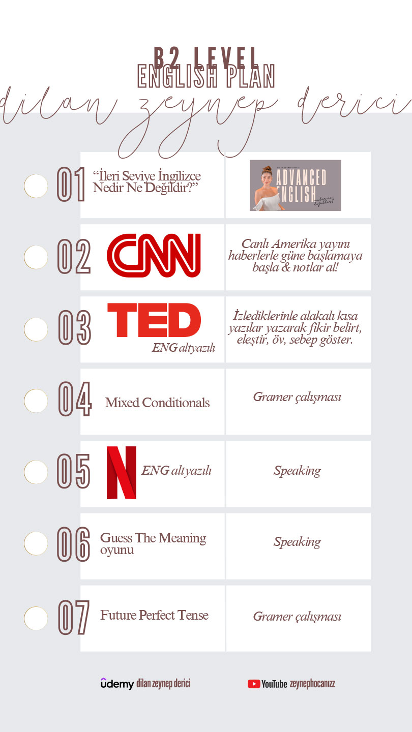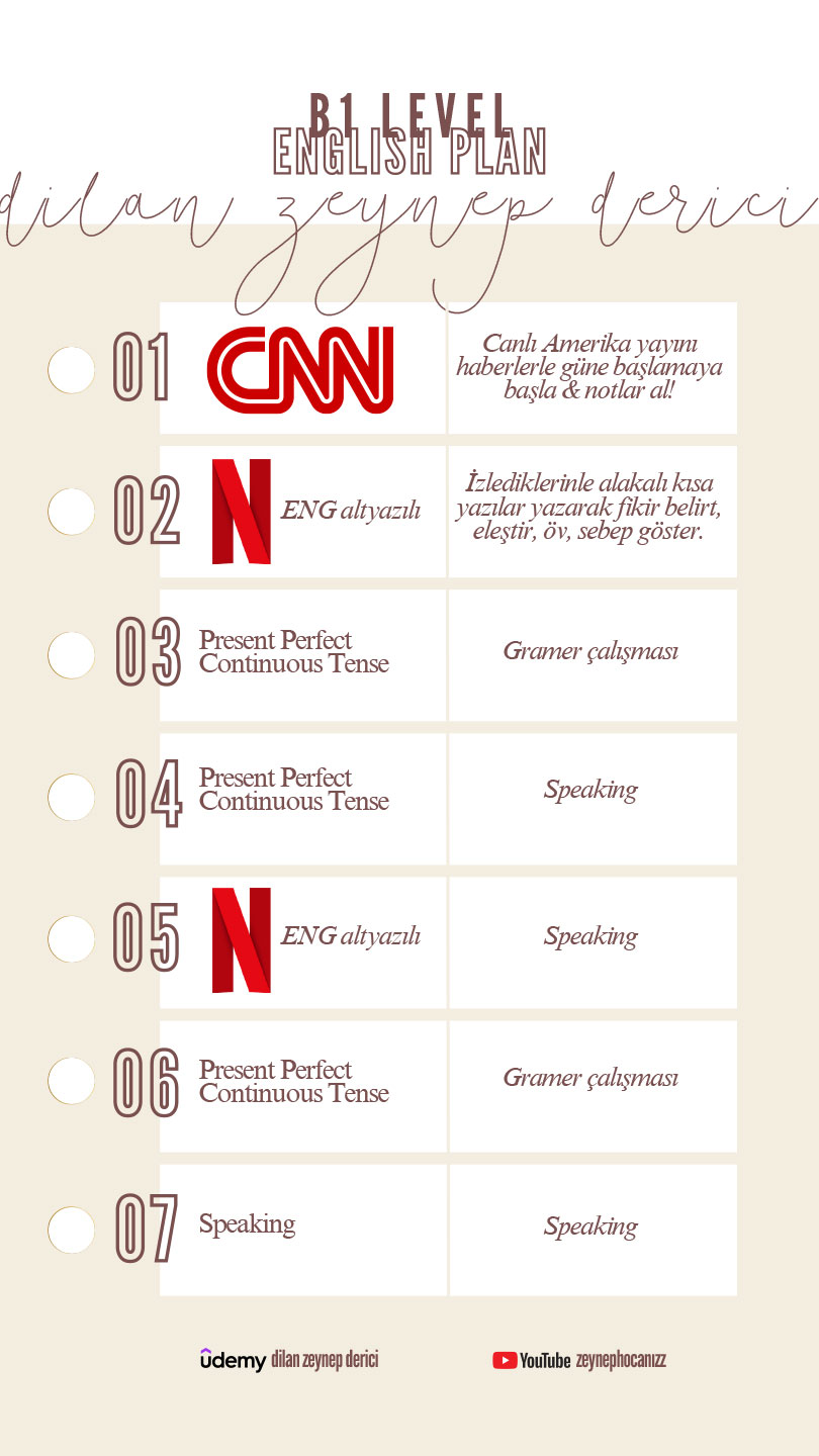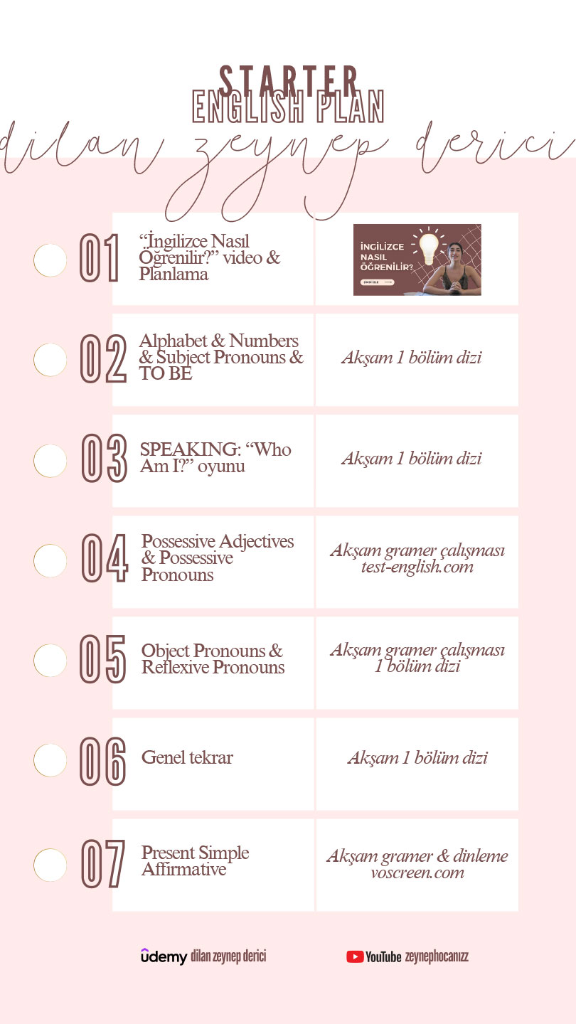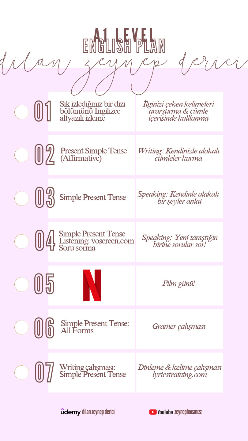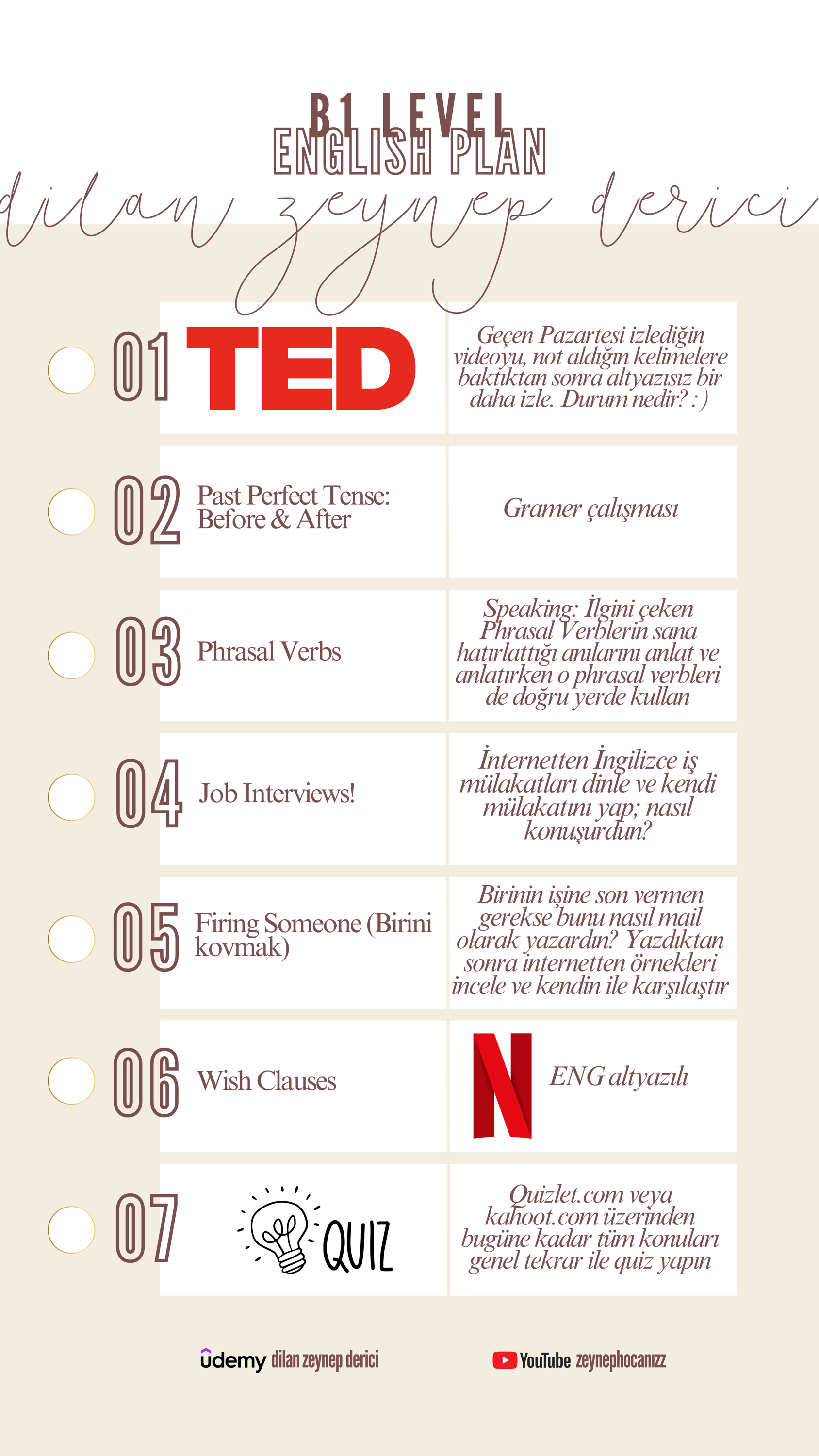 Bu listede her hafta düzenli yayınlanan haftalık İngilizce ders programlarını ve ilgili videoları bulabilirsin. Seviyeni seç ve birinci haftadan başla.