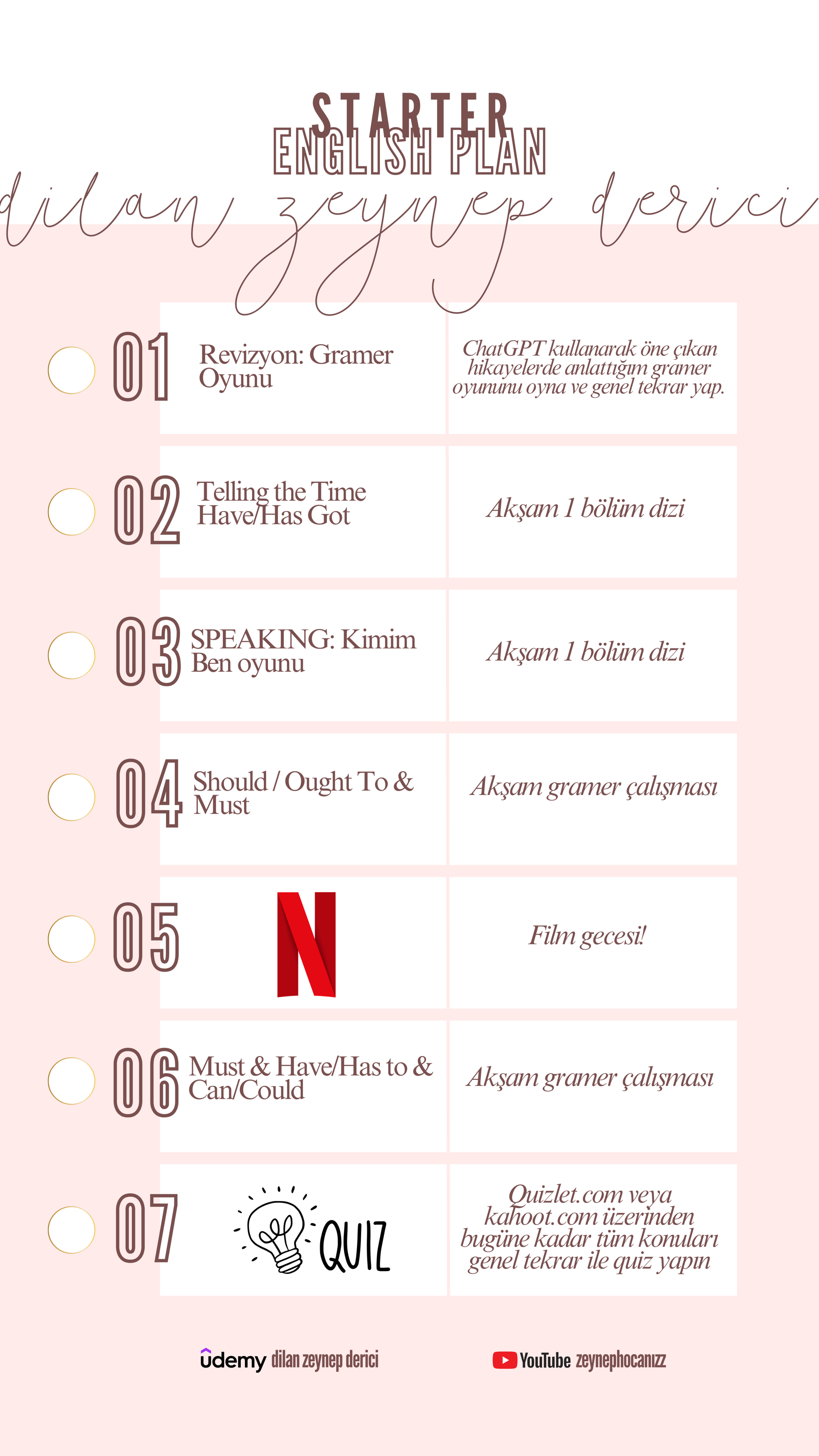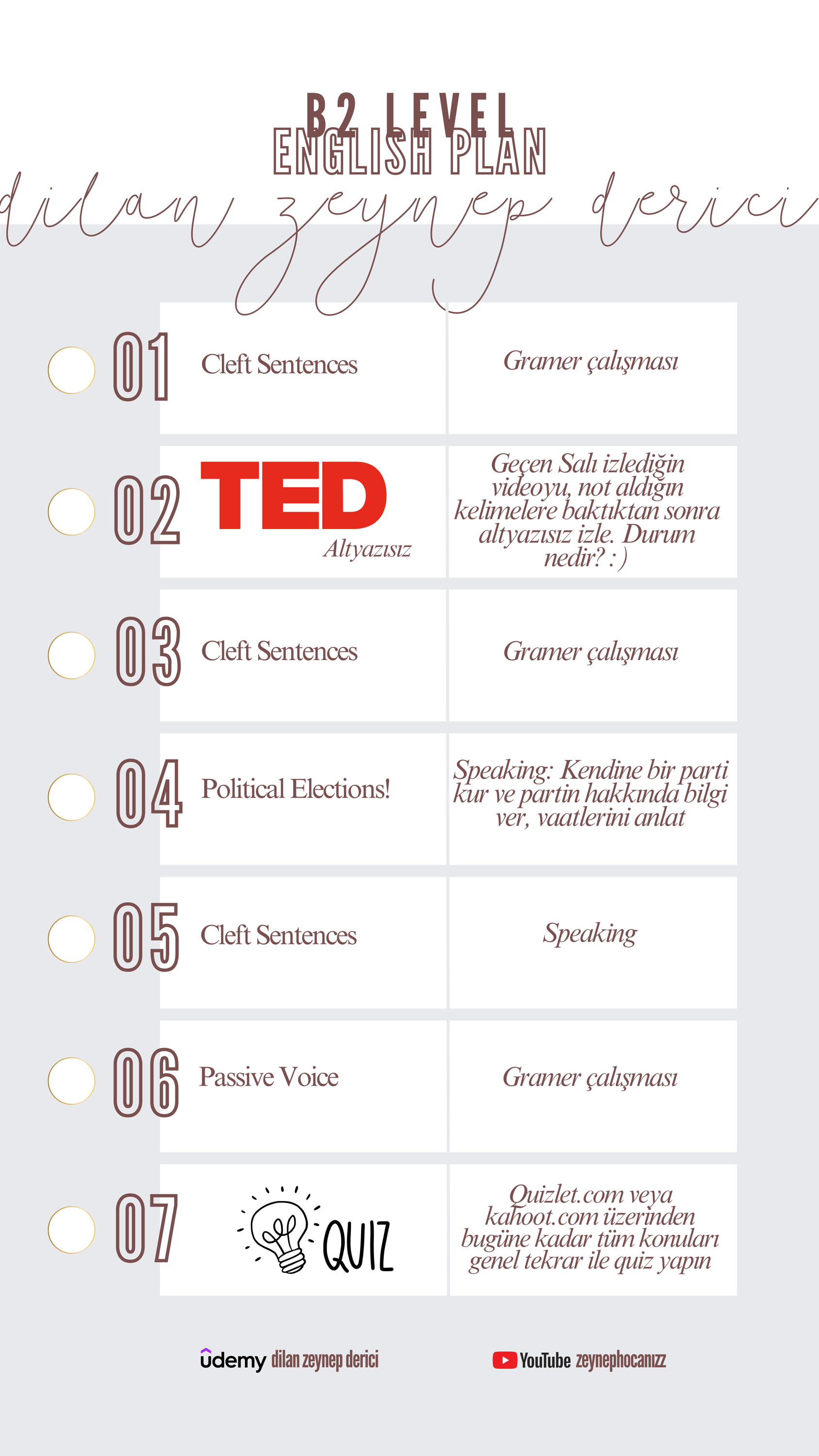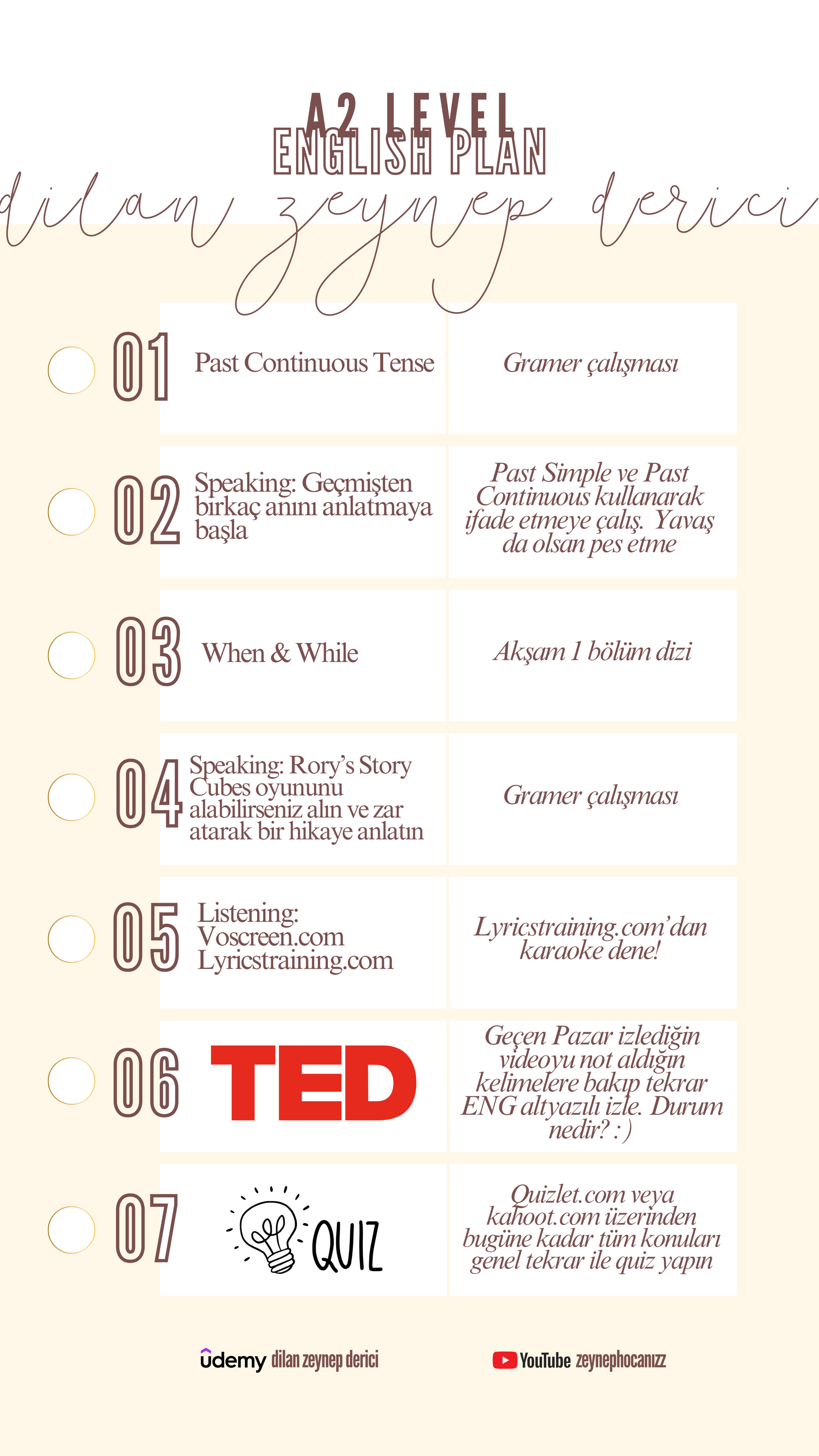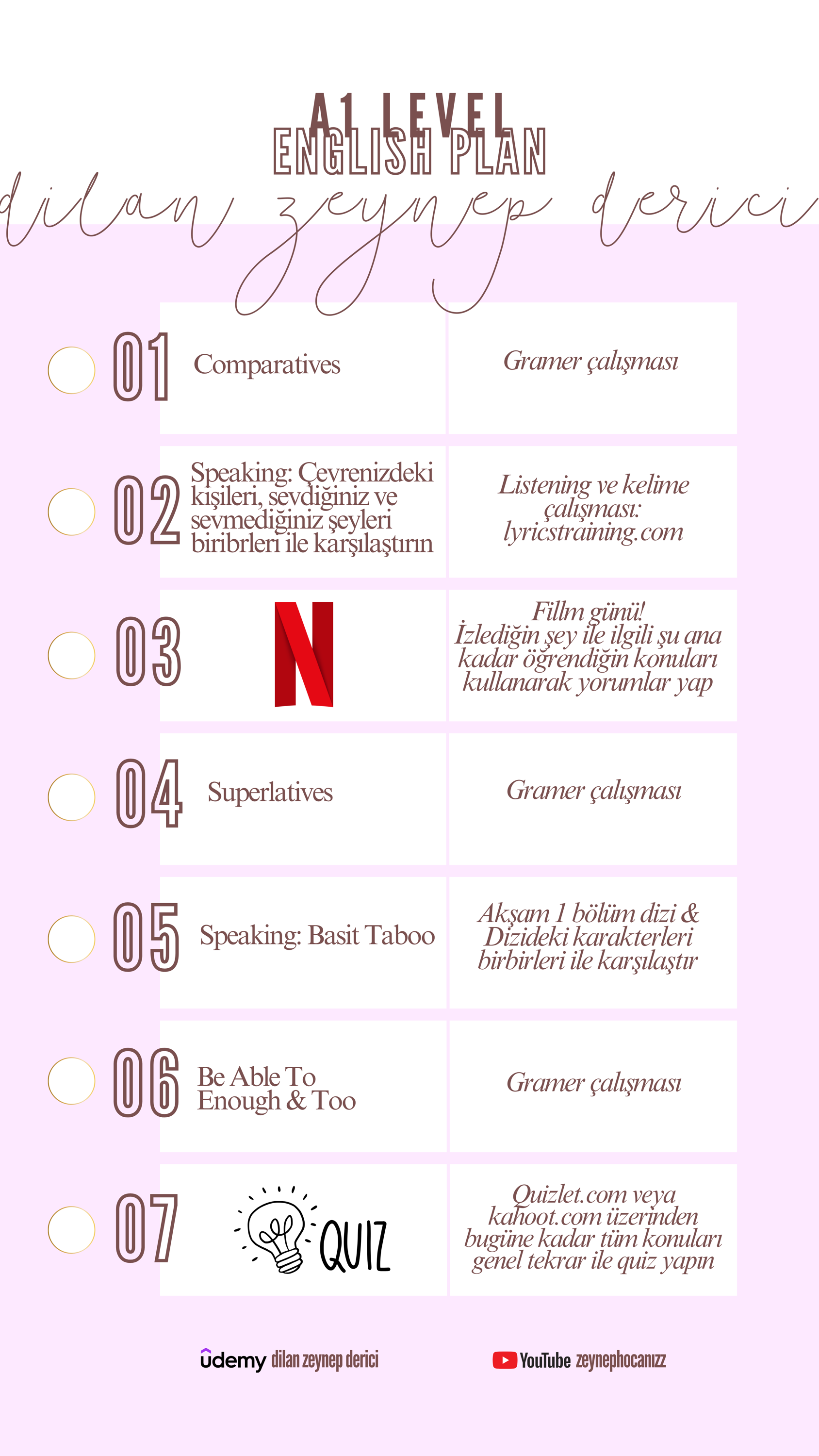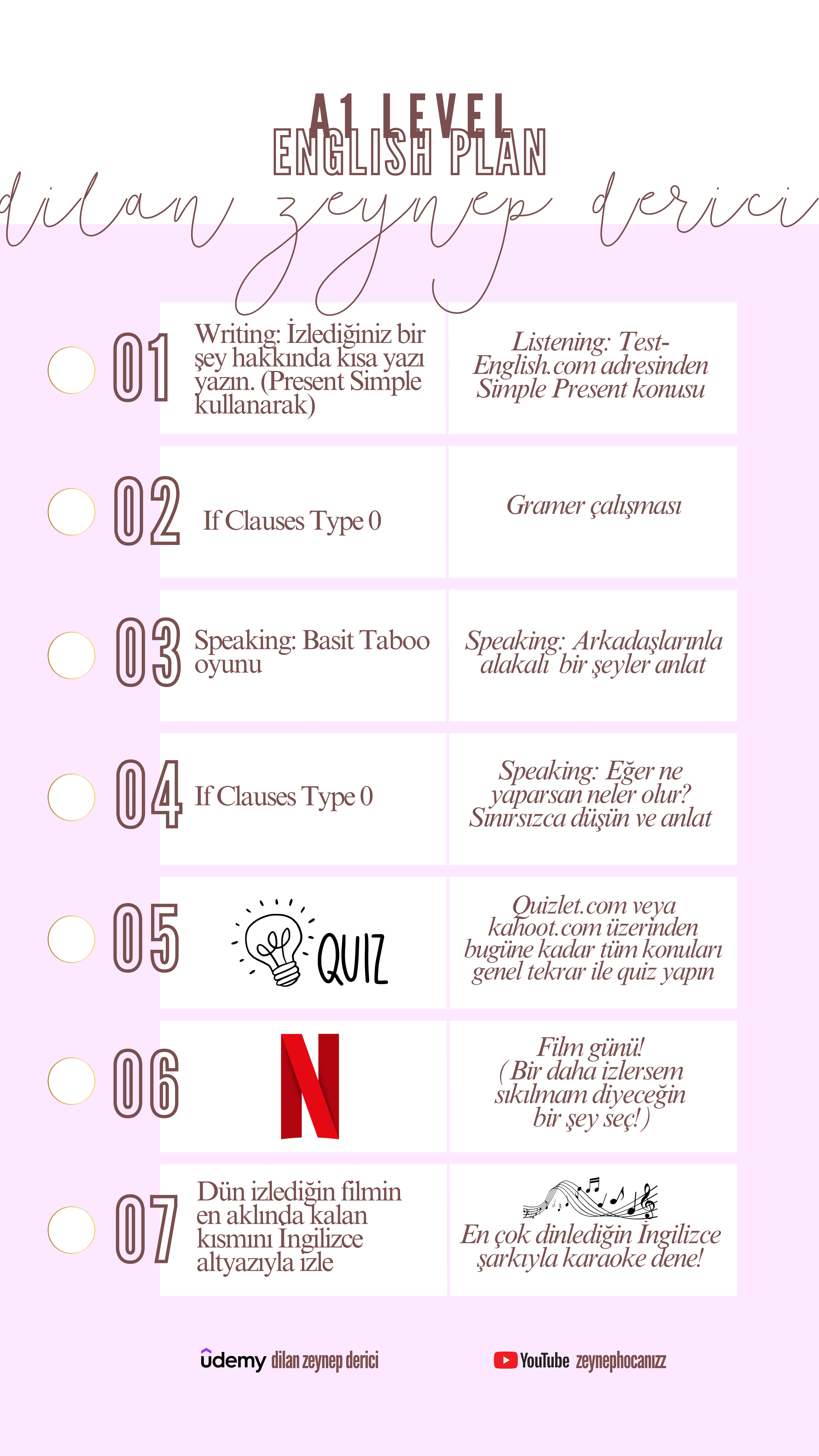 Bu listede her hafta düzenli yayınlanan haftalık İngilizce ders programlarını ve ilgili videoları bulabilirsin. Seviyeni seç ve birinci haftadan başla.